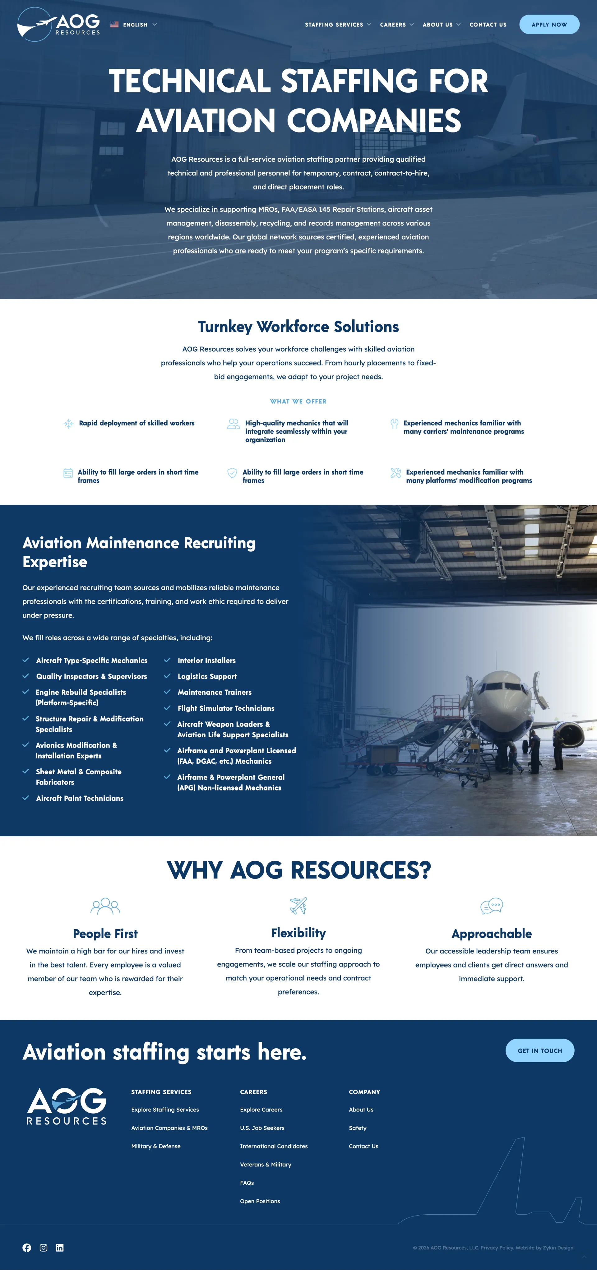 AOG Resources is a specialized aviation staffing firm that connects experienced aviation professionals with maintenance, repair, and overhaul (MRO) facilities around the world. Their previous website was outdated, text-heavy, and lacked cohesion with their newly commissioned logo.