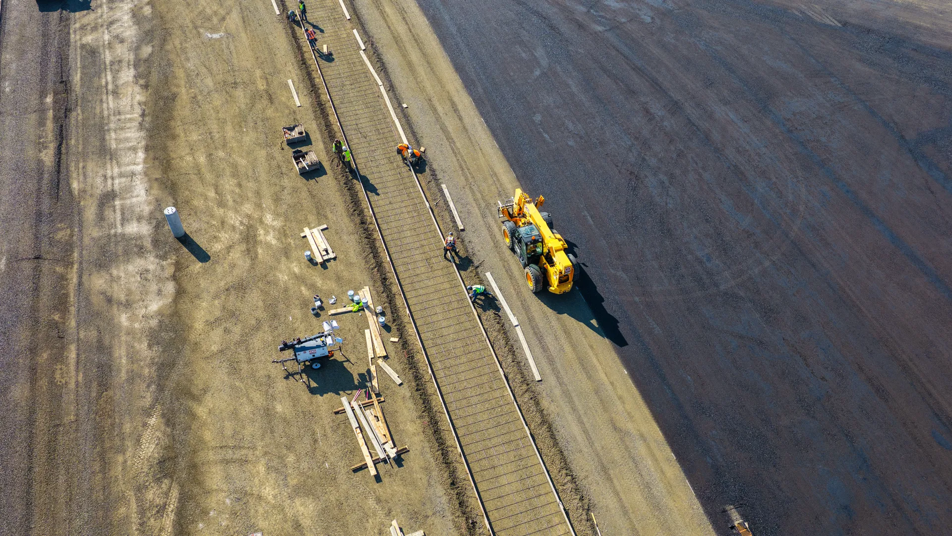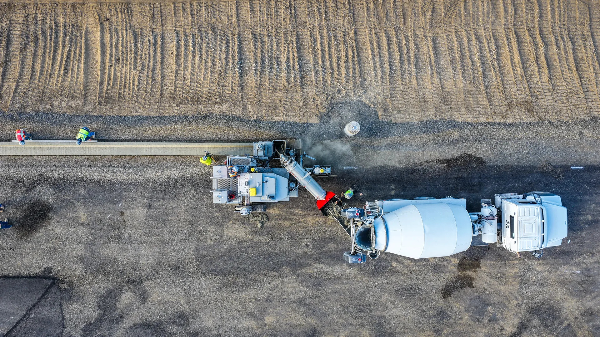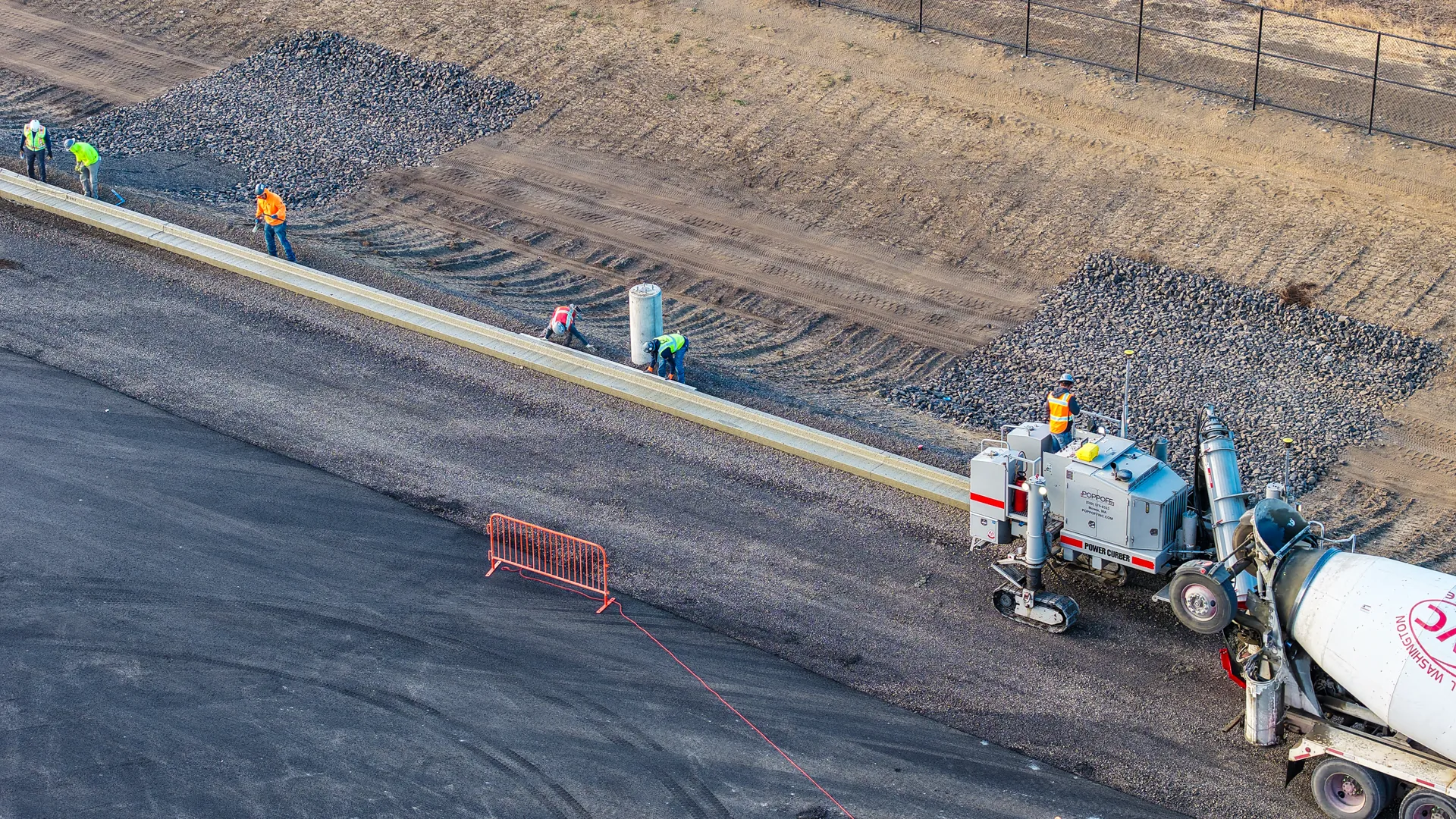 To kick off the project, we spent three days on-site with Poppoff's crew. The shoot covered everything: aerial footage with the drone, ground-level handheld work capturing the machines and the crew in action, close-up detail shots of equipment and finished surfaces, job site documentation across multiple locations, and shots of the team. The curb machine got its own dedicated attention, with footage of it spitting out a beautiful curb from both the ground level and air.