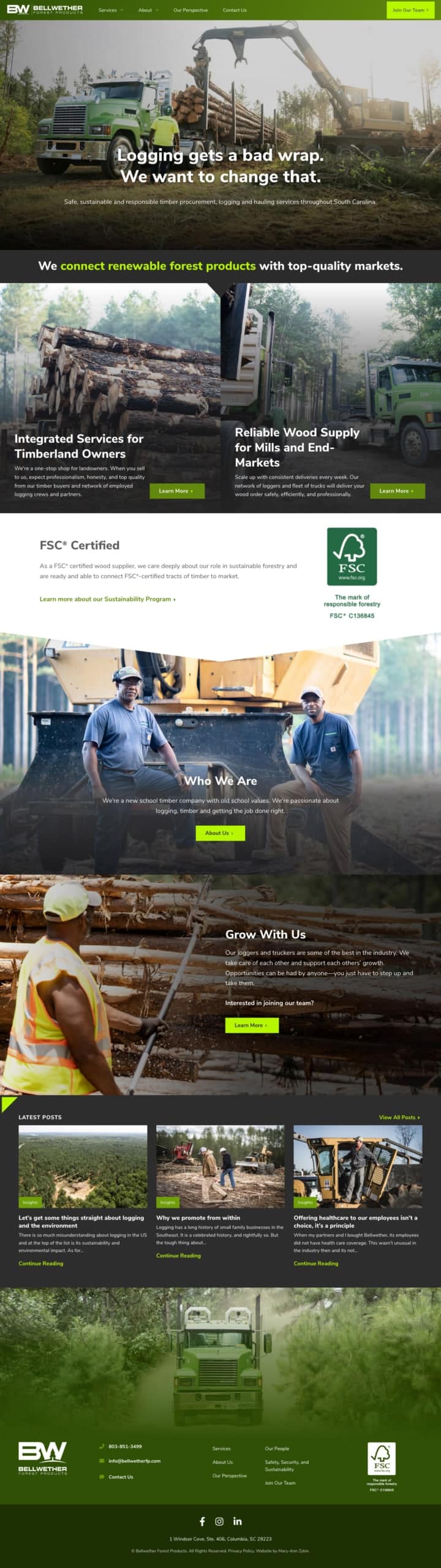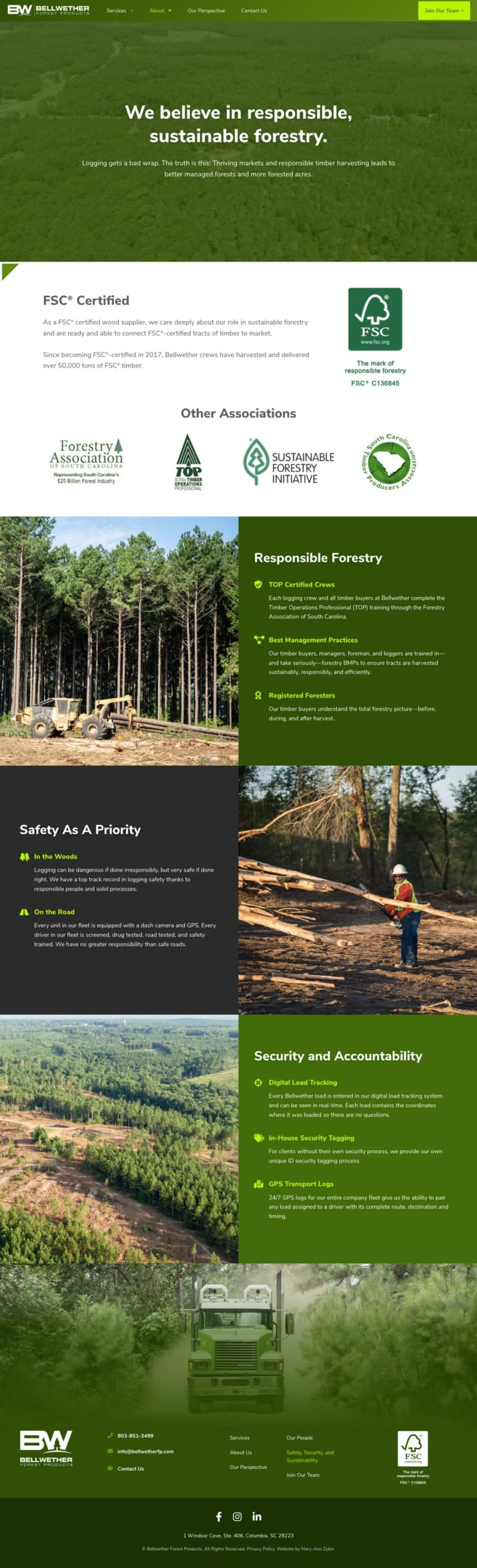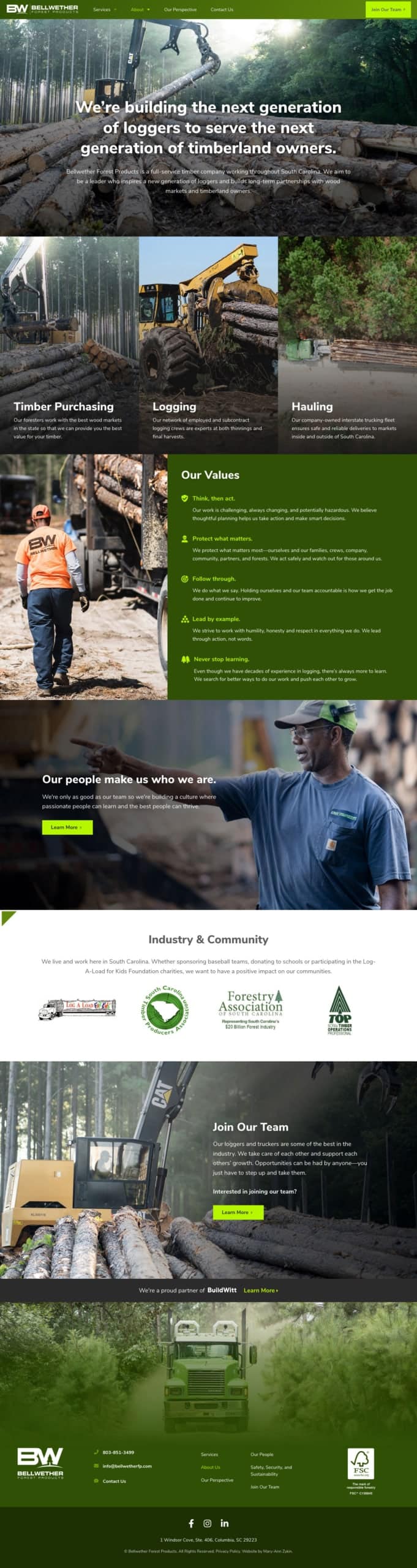 Bellwether Forest Products is a full-service provider of timber harvesting and hauling services. They have a number of large clients and customers on a regional and national level, but their old website didn't reflect the full scope of their services and the quality of the work they provide. Additionally, the old website was a poor recruitment tool for prospective employees and had a lot of room for improvement regarding content structure and highlighting career paths.