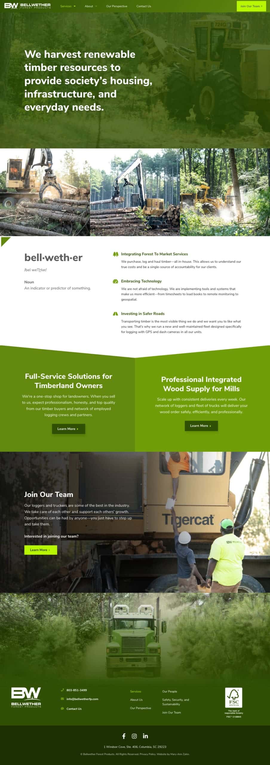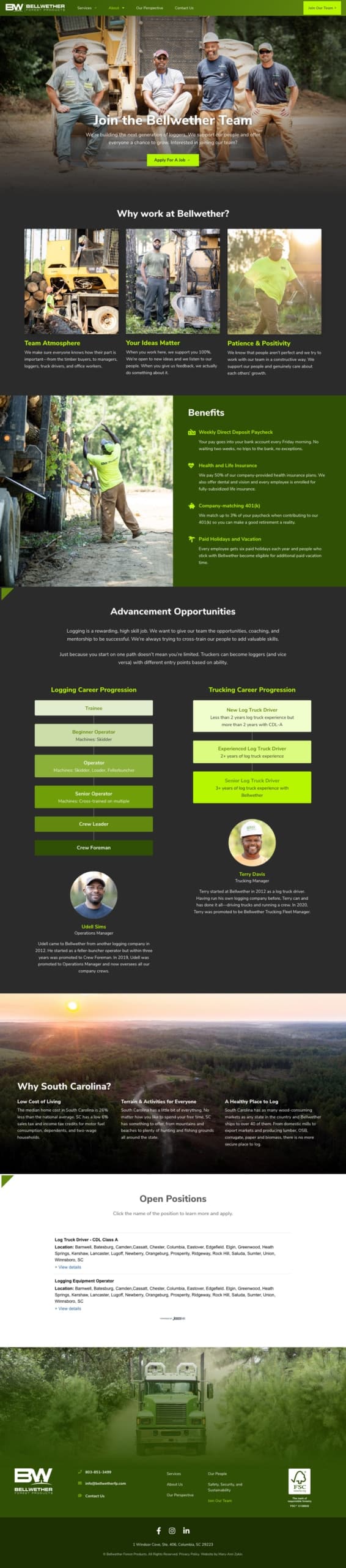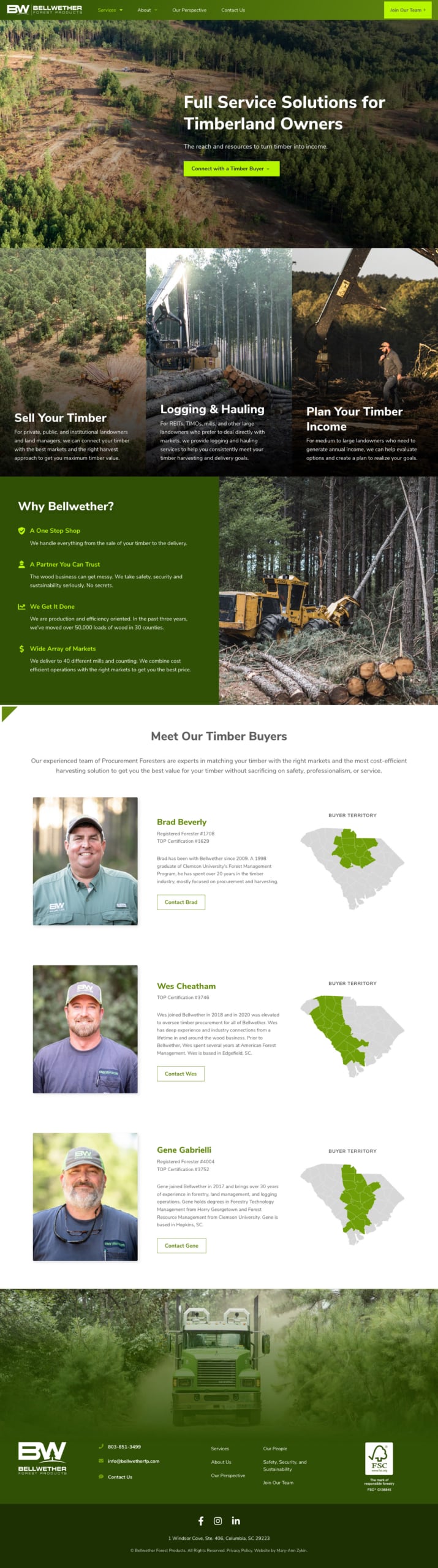 Bellwether Forest Products is a full-service provider of timber harvesting and hauling services. They have a number of large clients and customers on a regional and national level, but their old website didn't reflect the full scope of their services and the quality of the work they provide. Additionally, the old website was a poor recruitment tool for prospective employees and had a lot of room for improvement regarding content structure and highlighting career paths.
