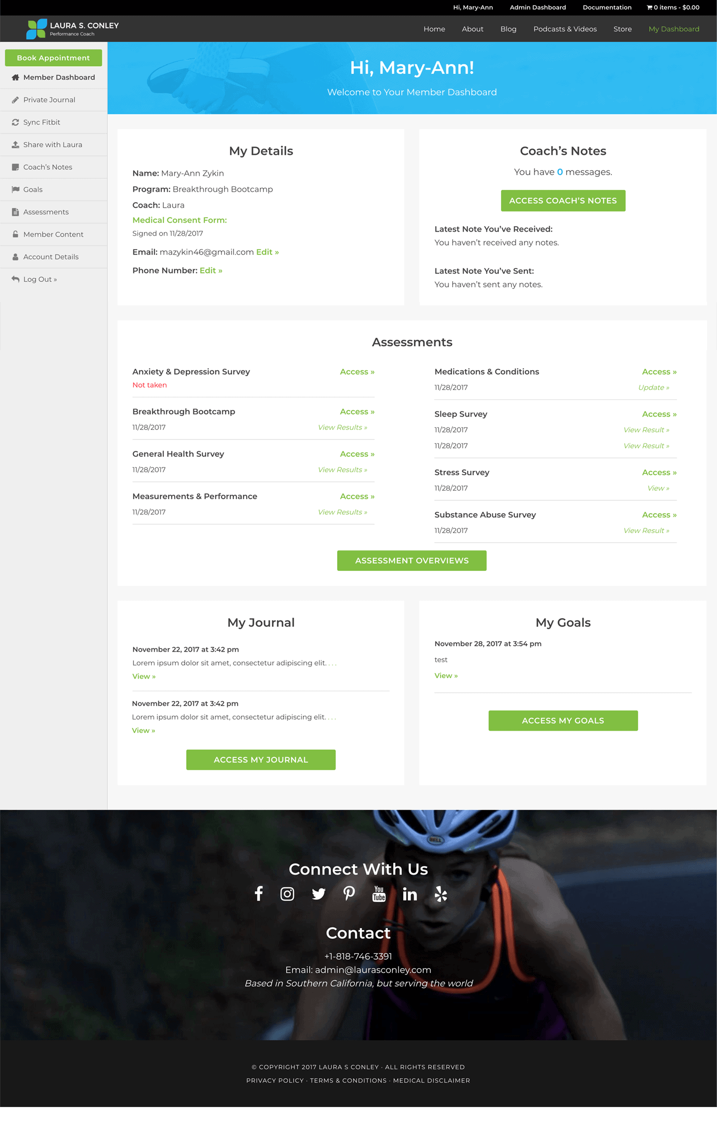 Laura’s coaching website is a membership portal to keep clients engaged on their wellness journey. Users stay on track by taking self-assessments, setting goals, adding journal entries, accessing exclusive content, and sharing notes or files with Laura. A separate admin dashboard was created to send messages to clients, view assessments, and review a client’s goals in order to find the best way to support them.
