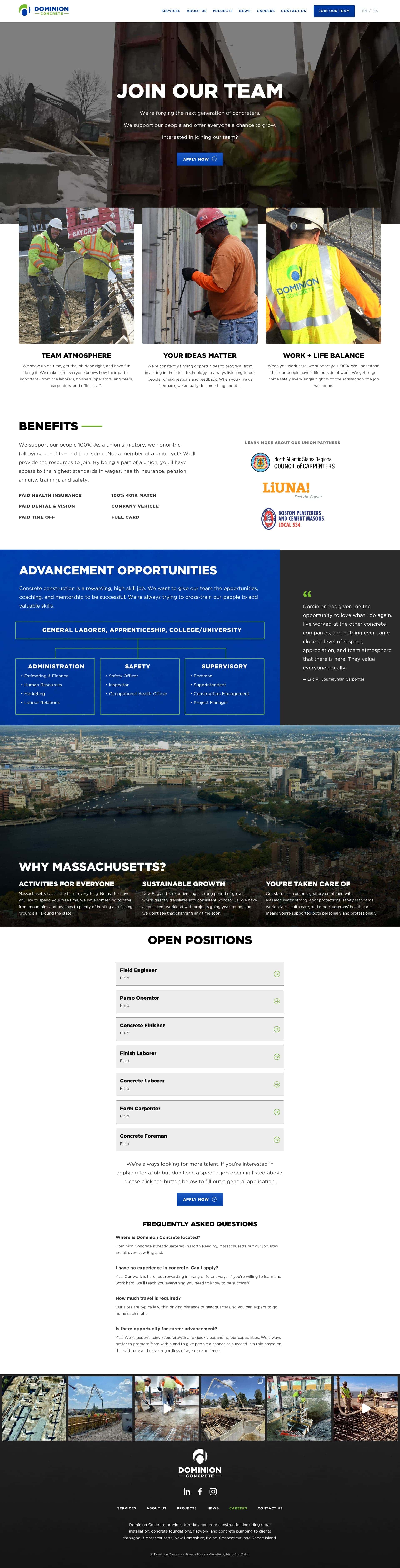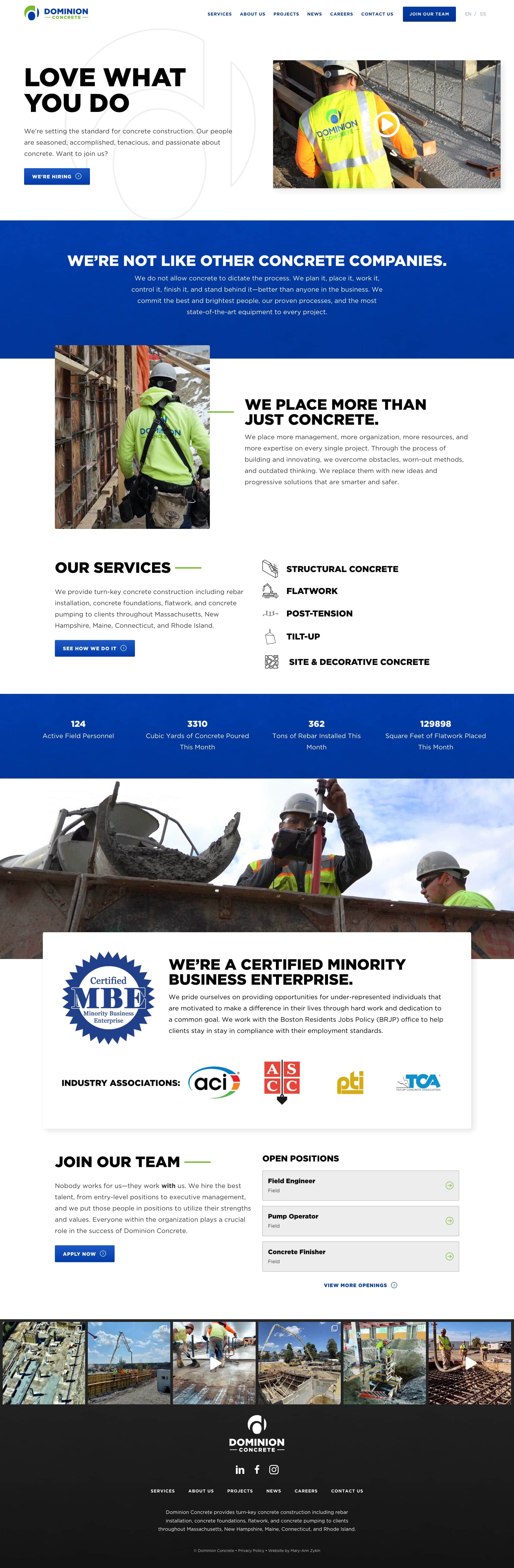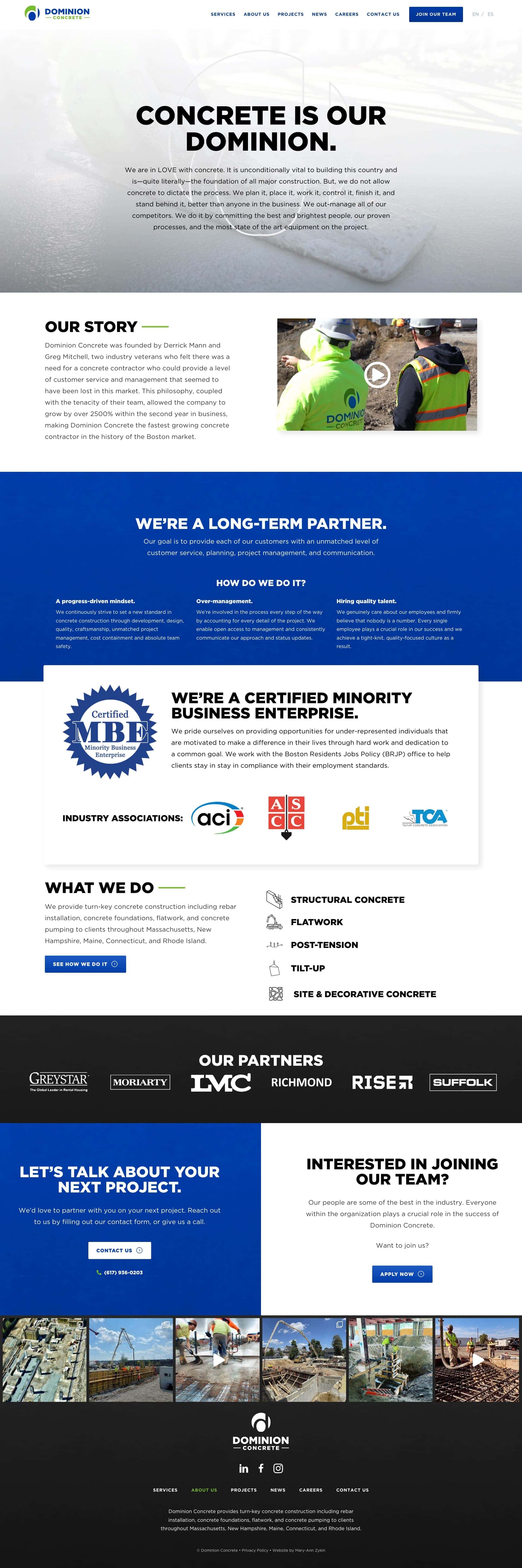 Dominion Concrete provides turnkey concrete services for customers across the Northeastern US. When I started working with them, they were a relatively new company formed only a few years prior. Their combination of a strong passion for concrete, a tight-knit culture, union job opportunities, and exciting projects enabled them to expand their workforce and contracts quickly, rapidly expanding their reach across New England.