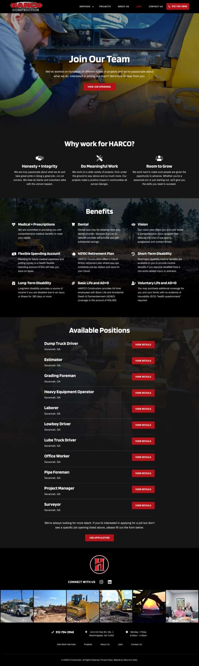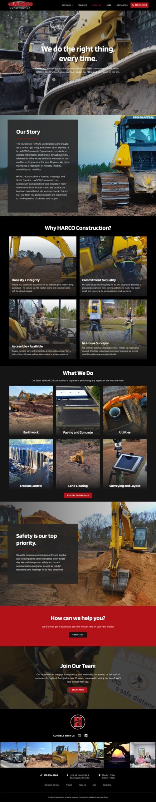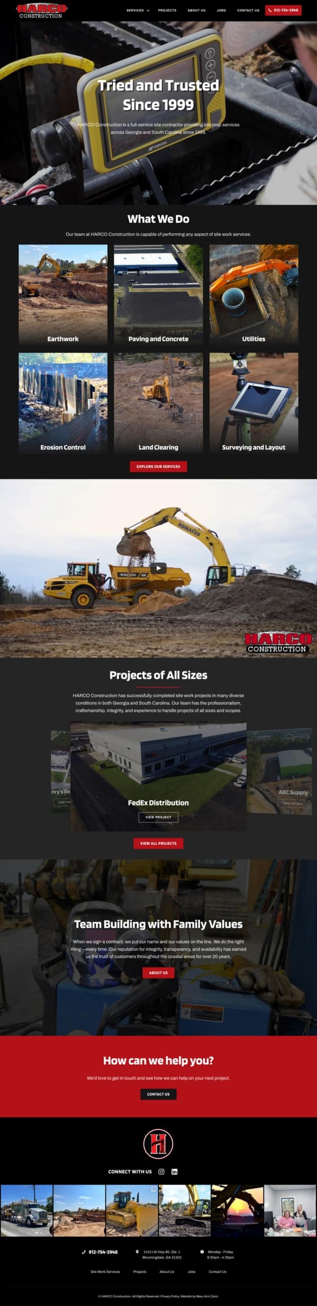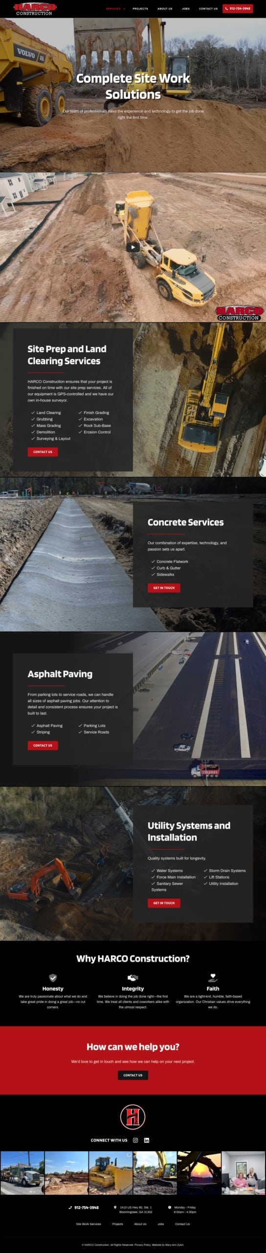 Harco Construction is a full-service provider of construction services for commercial and industrial clients. Although they’re a small company, they pack a lot of punch by having a number of large clients and customers on a regional level. Harco Construction hired me to create a new website that showcases the types of projects and breadth of services they provide by creating an engaging experience for site visitors through new content, photography, and videos. The company cares deeply about providing quality service and treating all customers and employees alike as family, so it was important for the verbiage to reflect that. The dark color scheme and vibrant red calls-to-action fit perfectly with the gritty, tough, high-quality work they provide for their customers.