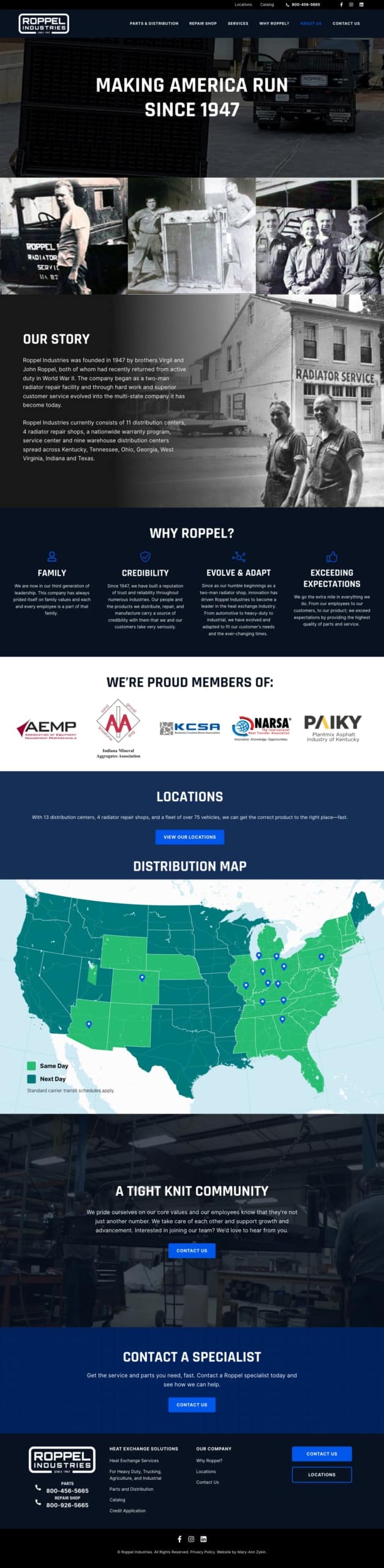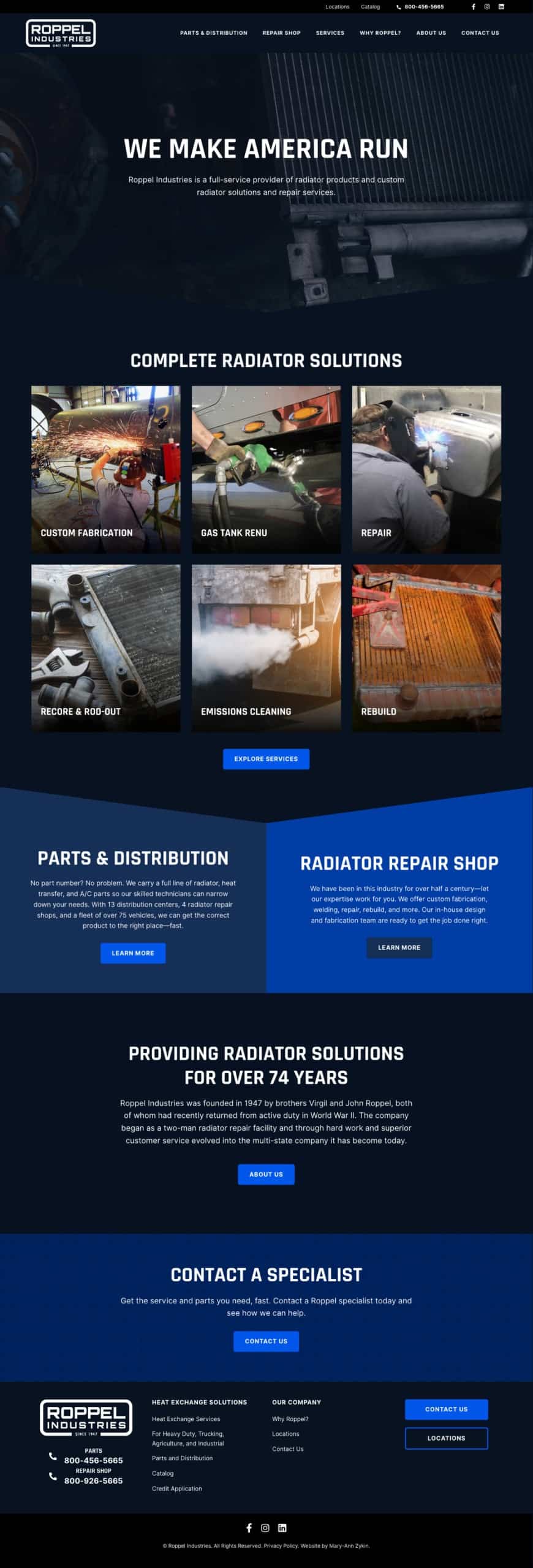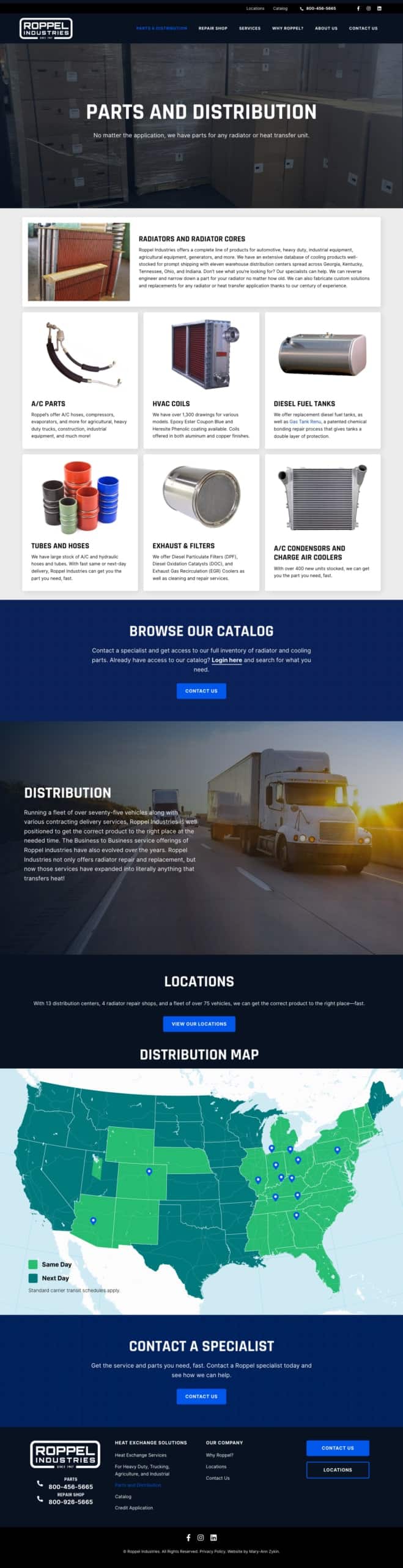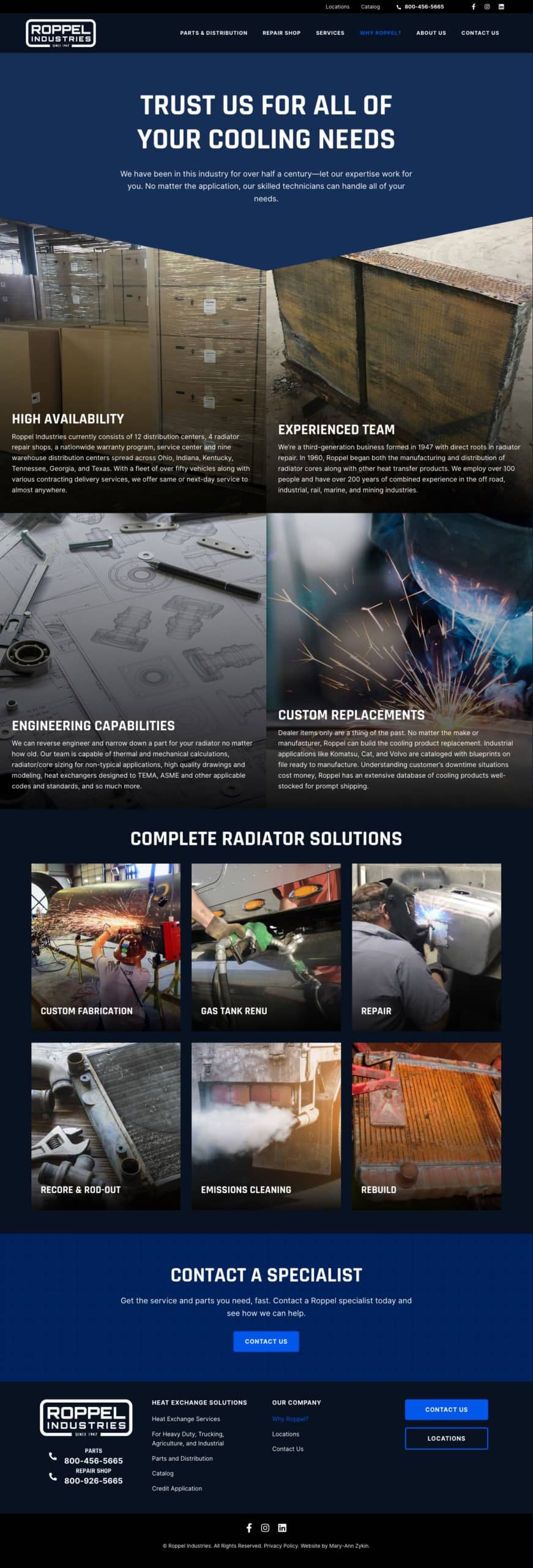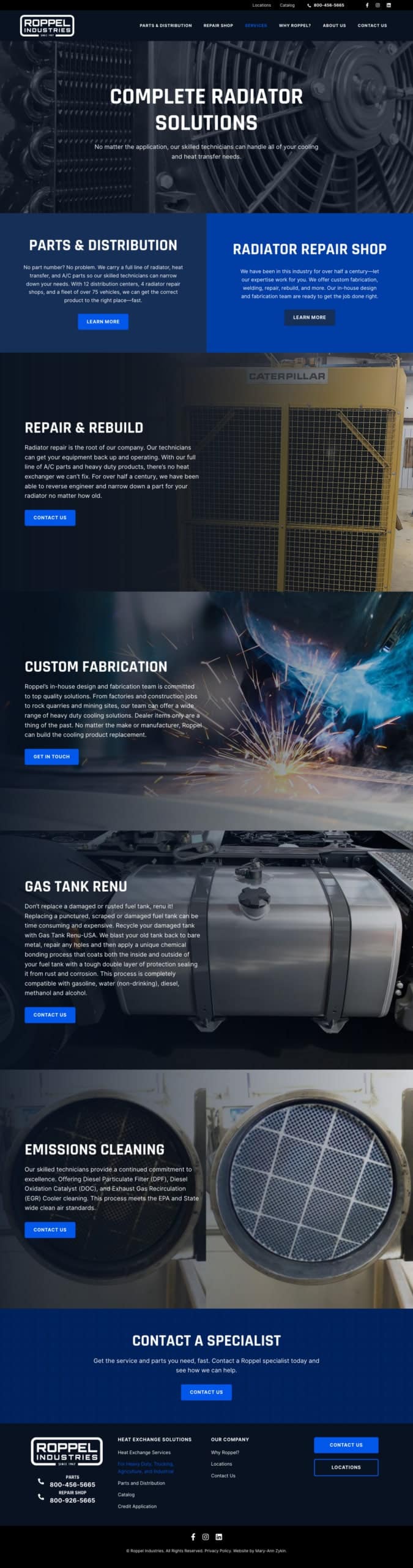 Roppel Radiator is an established provider of radiator fabrication and maintenance services for heavy industry and trucking, as well as other contract services. They've seen great success at a regional level, but by having two distinct websites for each target customer base, the company had a disjointed and confusing web presence. By having two websites each dedicated to parts and custom solutions, the company didn’t feel cohesive, therefore they decided to revamp their online identity under one umbrella (and domain name)—Roppel Industries.